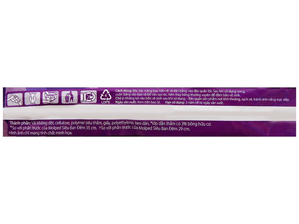 - Sử dụng một miếng mỗi đêm: Băng vệ sinh Molped Thiên Nhiên Ban Đêm được thiết kế để cung cấp sự bảo vệ tối đa trong khoảng thời gian từ 6 đến 8 giờ, đủ để bạn có một giấc ngủ thoải mái và an tâm mà không cần lo lắng về rò rỉ.