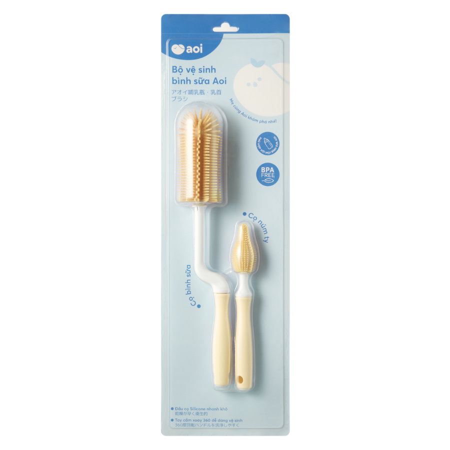 Bộ dụng cụ vệ sinh bình sữa gồm: 1 cọ bình sữa, 1 cọ núm ty