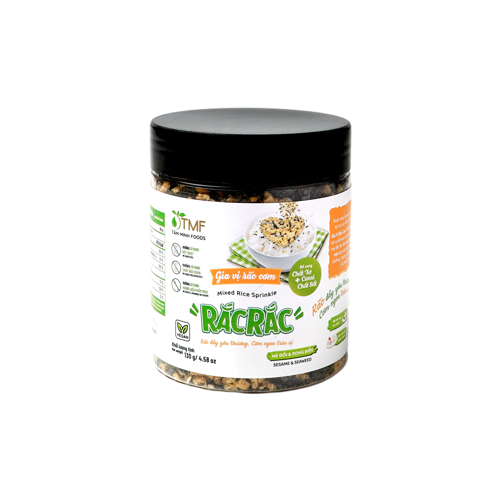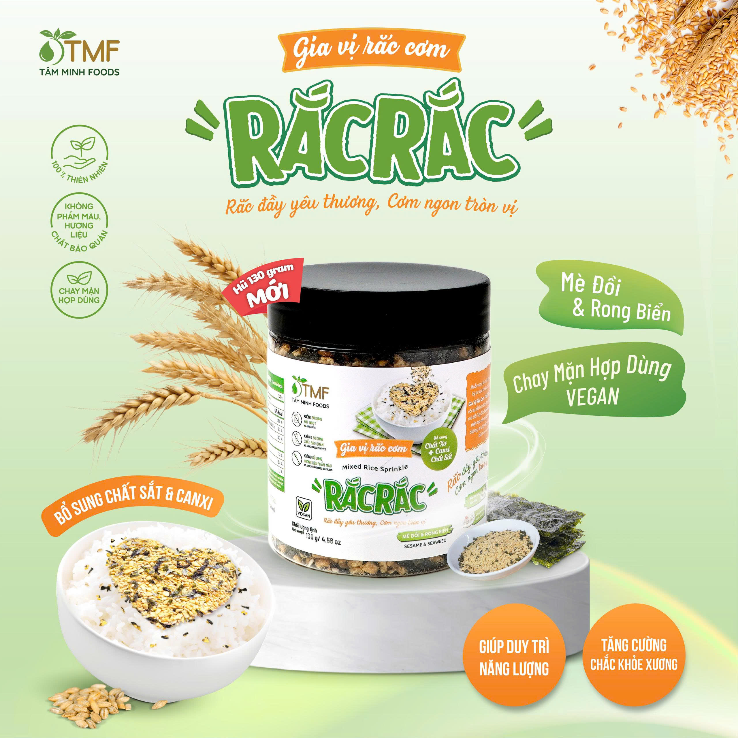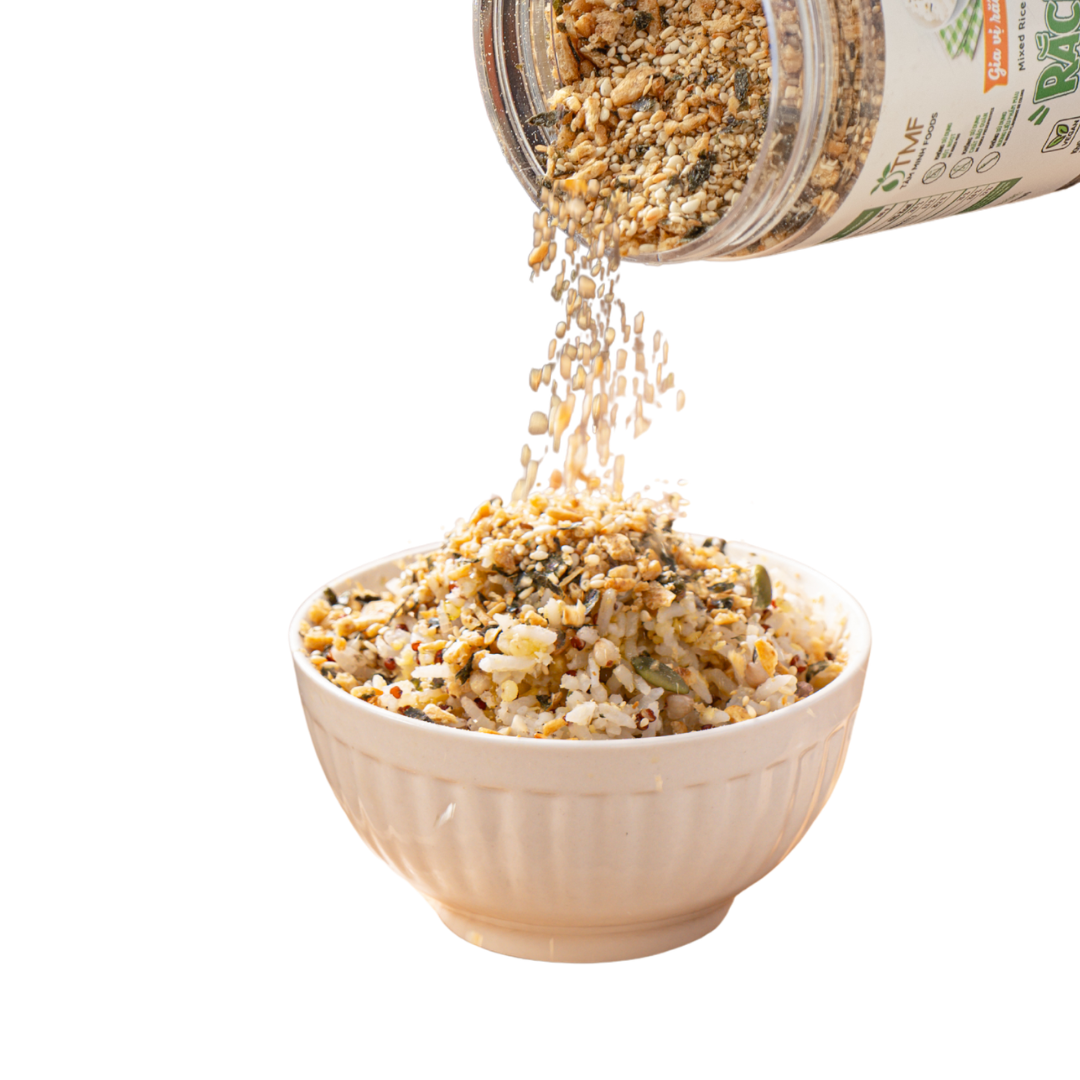 Gia vị rắc cơm Rắc Rắc hũ 130g là sự kết hợp của lúa mạch giòn rôm rốp, mè đồi Tây Bắc béo bùi và rong biển mằn mặn, tạo nên hương vị thơm ngon, đậm đà. Sản phẩm giữ được nét đặc trưng của muối vừng truyền thống, đồng thời mang đến trải nghiệm mới lạ cho bữa ăn.