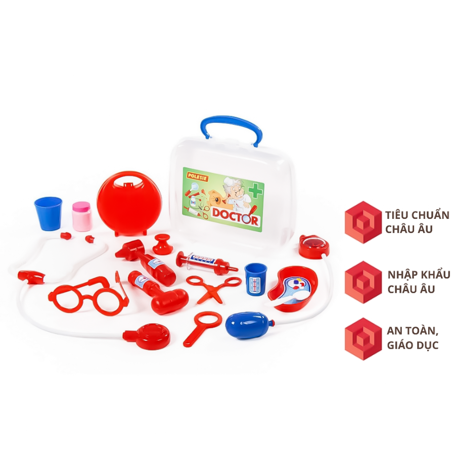 Bộ đồ chơi bác sĩ cho bé - 56559 được sản xuất theo dây chuyền hiện đại cao cấp tiêu chuẩn Châu Âu, có chứng nhận của Tổng cục TCĐL Chất lượng Mỹ và Nhật Bản. Thương hiệu đồ chơi Polesie được sản xuất và nhập khẩu 100% từ CHÂU ÂU, được phân phối độc quyền tại Việt Nam - Hàng đầu về đồ chơi trẻ em, đồ chơi cho bé an toàn, đồ chơi giáo dục, đồ chơi sáng tạo, đồ chơi hướng nghiệp...