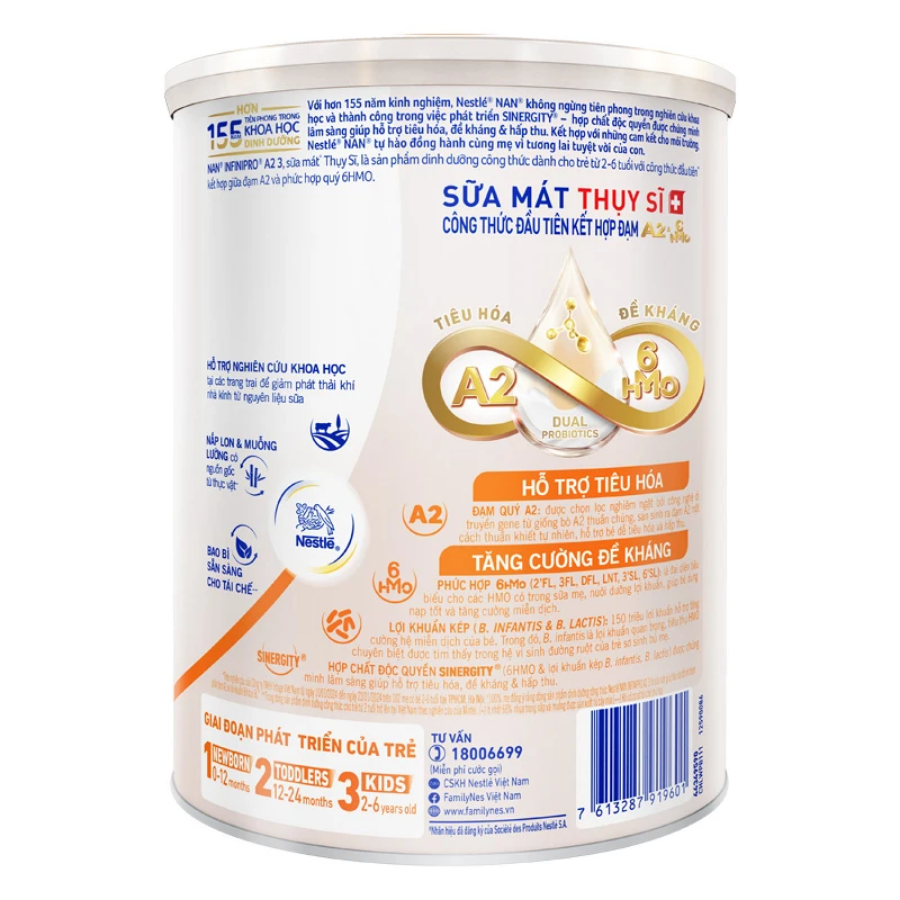 Công thức SINERGITY độc quyền từ Nestlé NAN - sự cộng hưởng giữa 6 loại HMO và hệ lợi khuẩn kép - giúp gia tăng bifidobacteria trong đường ruột, đồng thời thúc đẩy sản sinh SCFAs (axit béo chuỗi ngắn) – dưỡng chất quan trọng giúp điều hòa miễn dịch và nâng cao khả năng hấp thu dinh dưỡng cho trẻ.