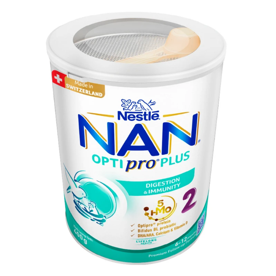 Sữa bột NAN Optipro Plus số 2 400g chứa 100 triệu lợi khuẩn bifidus BL được chứng minh lâm sàng giúp tăng thêm 200% lượng IgA (kháng thể miễn dịch quan trọng nhất của sữa mẹ) và giúp tăng cường chức năng tiêu hóa, giảm 49% nguy cơ tiêu chảy ở trẻ dưới 1 tuổi.