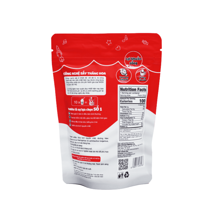 Thành phần an toàn: Sữa chua sấy thăng hoa YoBite sử dụng sữa tươi nguyên chất, không sử dụng sữa bột hoàn nguyên, chất bảo quản, phẩm màu hay hương liệu.