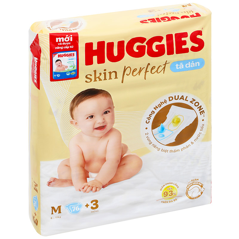 Bề mặt tã Huggies Skin Perfect được sản xuất với công nghệ Dual Zone hiện đại có 2 vùng thấm nước tiểu và phân lỏng riêng biệt, nhằm ngăn sự phát triển của vi khuẩn trên da.