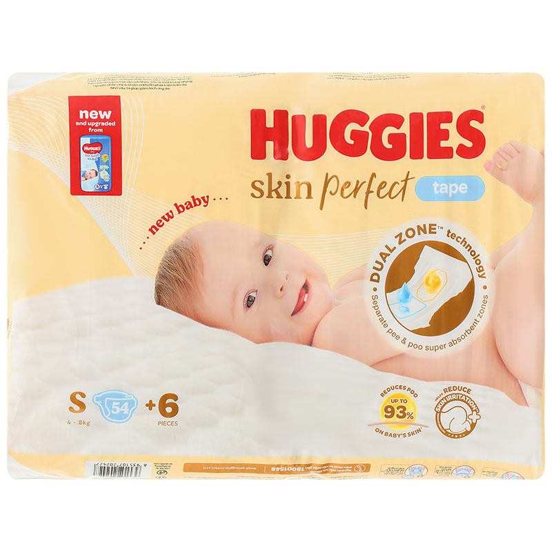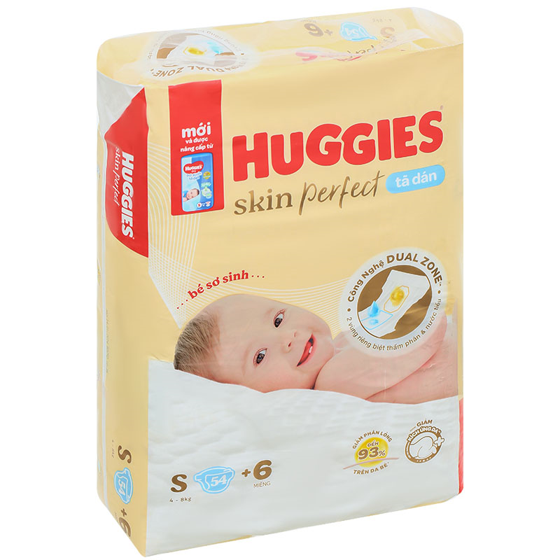 Tã dán Huggies Skin Perfect size S 54 + 6 miếng (4 - 8 kg) giúp thấm hút hiệu quả, bảo vệ da bé, duy trì độ pH ổn định, ngăn ngừa kích ứng da. Mua ngay tại Yokidsplaza.com