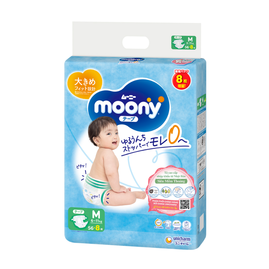 Tã dán Moony (M, 56 miếng + 8 miếng) là loại bỉm dành cho các bé thuộc thương hiệu Moony nổi tiếng tại Nhật Bản, được sản xuất bởi tập đoàn Unicharm danh tiếng. Bỉm tã Moony áp dụng công nghệ hoàn toàn mới ở phần hông với màng vải thun êm mềm, co giãn tuyệt đối.
