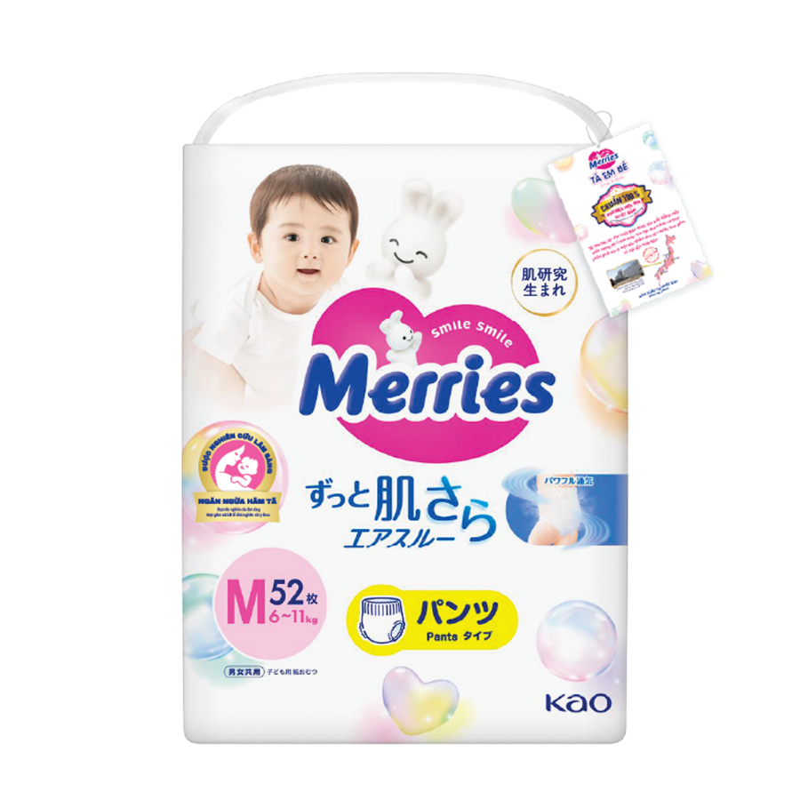 Tã quần Merries (M, 6-11kg, 52 miếng) là sản phẩm dành cho bé từ 12-22kg đến từ thương hiệu uy tín Merries của Nhật Bản. Tã quần Merries – một sản phẩm mang tính đột phá đến từ Nhật Bản, khác biệt hoàn toàn so với những loại tã giấy khác trên thị trường, đặc biệt mỏng nhẹ giúp bé tung tăng chạy nhảy suốt 24h mà vẫn khô thoáng và êm dịu.