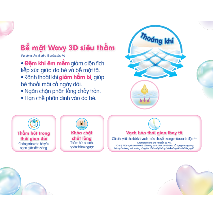 Siêu thông thoáng với chất liệu màng đáy thoát khí đặc biệt. Các đường thun được thiết kế để không khí dễ dàng thổi qua giữa miếng tã và da. Bé sẽ luôn cảm thấy khô ráo ngay cả khi vân động nhiều.