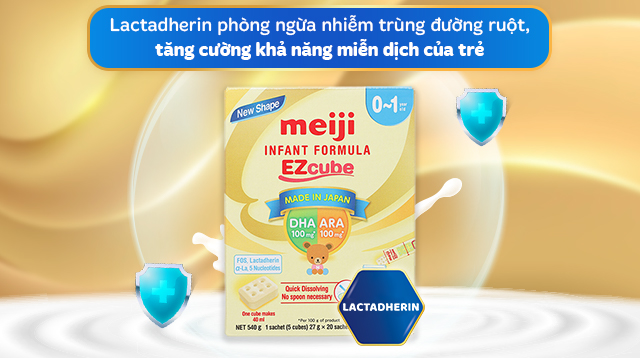 Sữa Meiji chứa lactadherin giúp bảo vệ bé khỏi nhiễm trùng đường ruột do virus, đặc biệt là virus gây bệnh tiêu chảy. Lactadherin hỗ trợ tăng cường hệ miễn dịch, giúp bé luôn khỏe mạnh và giảm nguy cơ mắc các bệnh nhiễm trùng.