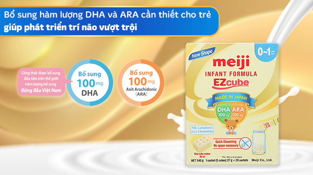 Sữa Meiji Infant Formula Ezcube 540g bổ sung 100 mg DHA và 100 mg ARA – hai dưỡng chất thiết yếu giúp phát triển não bộ và võng mạc của trẻ. DHA và ARA đóng vai trò quan trọng trong việc tăng cường khả năng nhận thức, học hỏi và cải thiện thị lực, phù hợp với các tiêu chuẩn của WHO.